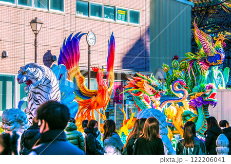 日本の横浜都市景観7年2月。2025春節燈花。山下町公園・「會芳亭」前に聖獣がズラリ…=6日