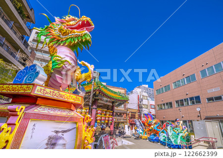 日本の横浜都市景観春節の神輿くぐり。横浜中華街・横浜媽祖廟などを望む。新時代へ=令和7年2月6日
