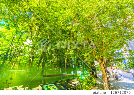 日本の東京都市景観 緑溢れる大手町。アーバンネット大手町ビルや大手町プレイスなど、摩天楼を望む=2月