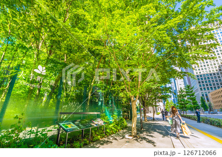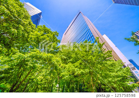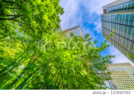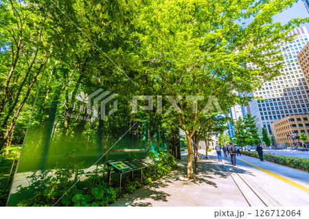 日本の東京都市景観 緑溢れる大手町。アーバンネット大手町ビルや大手町野村ビルなど、摩天楼を望む=2月