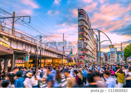 日本の東京都市景観10月。インバウンド続く…外国人観光客らで賑わう上野駅前。奥は上野御徒町中央通り