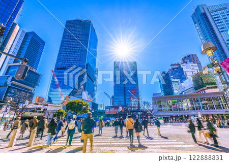 日本の東京都市景観 2月…賑わう渋谷。…6棟が林立し、渋谷駅再開発も進む…新時代へ希望の光=11日