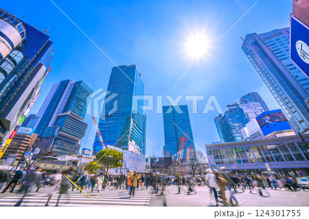 日本の東京都市景観 XEC株…“夏空“…のような青空が広がる…賑わう渋谷=3月7日