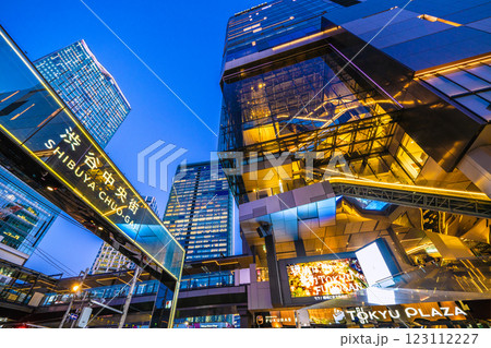 日本の東京都市景観 渋谷駅前のビル群や渋谷中央街(黄色く点灯)、東急プラザなどを望む