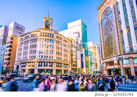 日本の東京都市景観外国人観光客らで賑わう銀座四丁目や夕日に映えるセイコーハウス銀座などを望む=21日