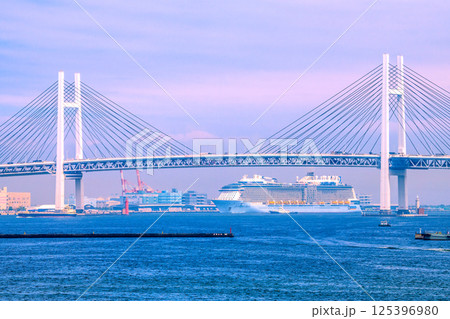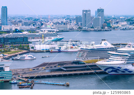 日本の横浜都市景観ノルウェージャン・スピリットやぷかりさん橋などを望む