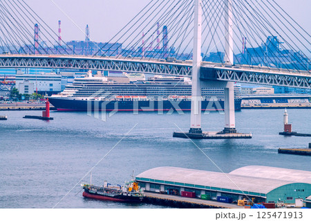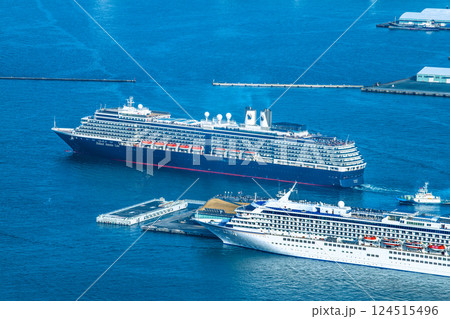 日本の横浜都市景観2隻の豪華客船。ノルウェージャン・スピリットやクイーン・エリザベスなどを望む