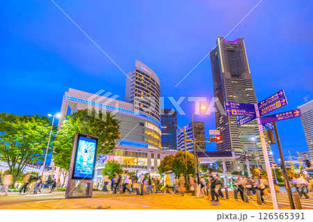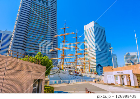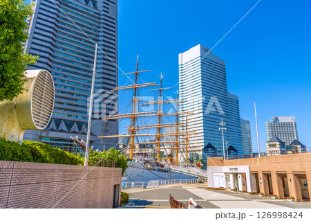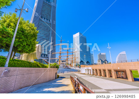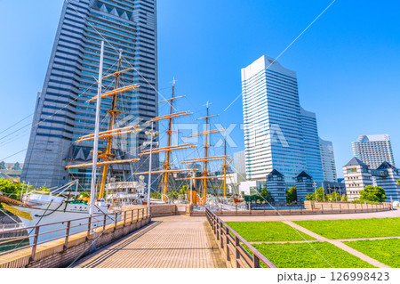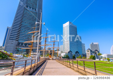 日本の東京都市景観 桜木町駅前のビル群や帆船日本丸などを望む