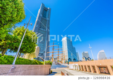 日本の横浜都市景観 帆船日本丸や横浜ランドマークタワーなどを望む