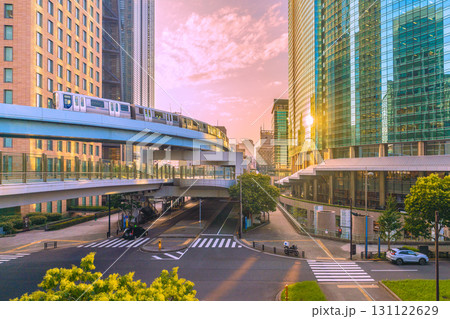 日本の東京都市景観珍景。太陽光を反射するゆりかもめや汐留駅、汐留のオフィス街を望む。新時代へ希望の光