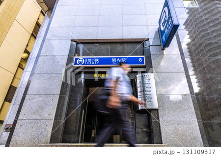 日本の横浜都市景観8番出口…馬車道の歩道から横浜市営地下鉄 関内駅(出入口8)などを望む