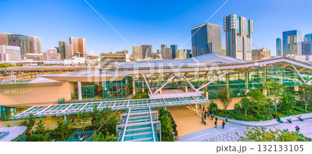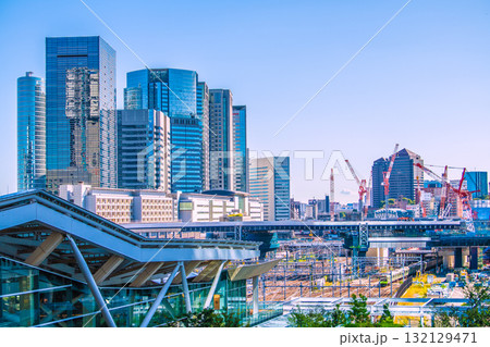 日本の東京都市景観 品川駅やオフィスビル群などを望む。手前は高輪ゲートウェイ駅