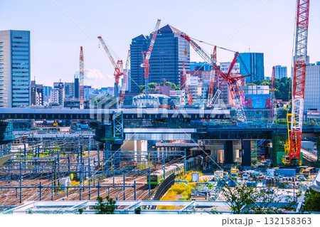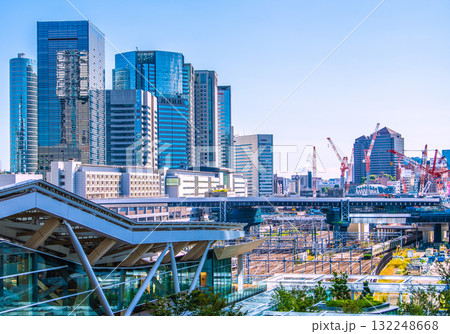 日本の東京都市景観 品川駅やオフィスビル群、電車などを望む。手前は高輪ゲートウェイ駅