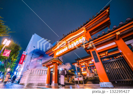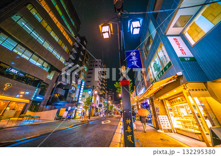 日本の東京都市景観 情緒漂う街。小雨が“舞う”情緒あふれる夜の神楽坂。毘沙門天などを望む