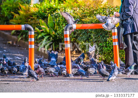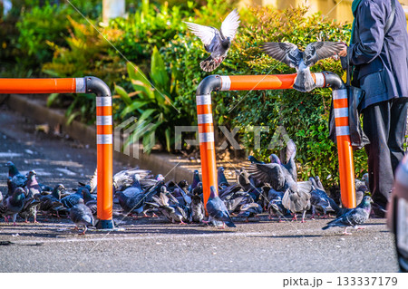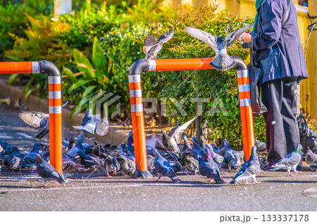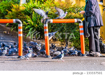 日本の東京都市景観 高田馬場駅前でハトに餌やりをする高齢の女性や群がるハトなどを望む
