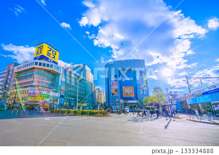 日本の東京都市景観鳩が… 高田馬場駅や太陽光、過行く雲などを望む。異常に鳩が多い
