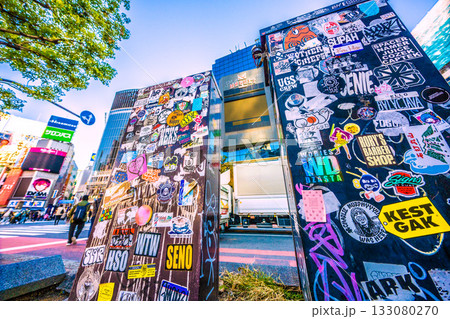 日本の東京都市景観剥がされたシール…早くも2枚目…。早朝の渋谷、幸福な時間…人影は少ない=8時11分