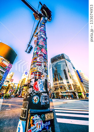 日本の東京都市景観 旅の想い出はシールとともに…朝日を浴びる交差点や信号の柱に貼られたステッカー等…