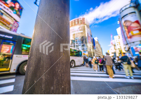 日本の東京都市景観インバウンドとシールの共存…朝日が差し込む交差点、外国人…新時代への模索…=渋谷