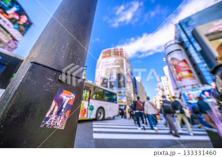 日本の東京都市景観11月24日、剥がされたシール…早くも4枚貼られ、必殺上貼りPR潰しも…=朝、渋谷