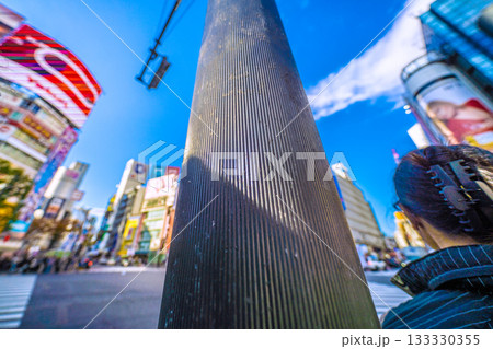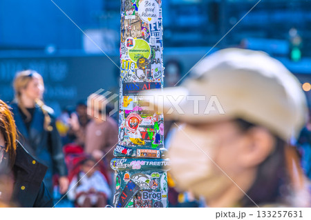 日本の東京都市景観剥がされたシール…早くも2枚目…。早朝の渋谷、幸福な時間…人影は少ない=8時11分