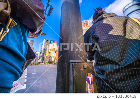 日本の東京都市景観シール剥がし作業開始…インバウンドとシールの共存は…日陰の交差点で作業中=渋谷