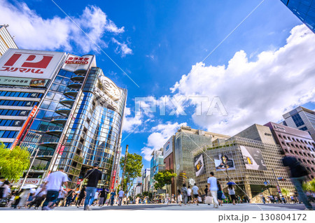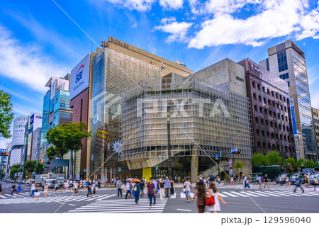 日本の東京都市景観8月8日。観光客らで賑わう数寄屋橋交差点やソニーパークなどを望む