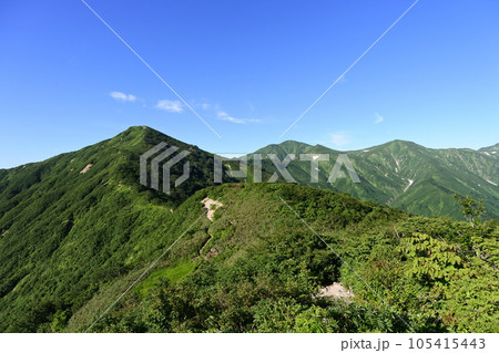 朝日連峰西朝日岳からの縦走路と以東岳遠望