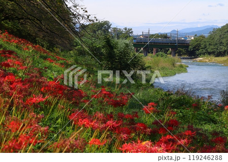 入間川遊歩道のヒガンバナと西武池袋線20000系電車(埼玉県狭山市)