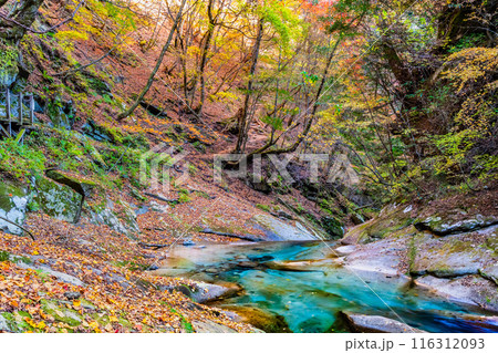 山梨県山梨市三富川浦 笛吹川の上流に位置する西沢渓谷のハイキングコースからの渓流の紅葉の景色