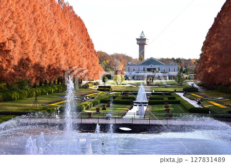 神奈川県立相模原公園のフランス式庭園とメタセコイア並木の紅葉