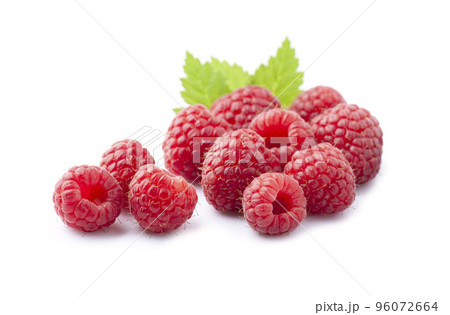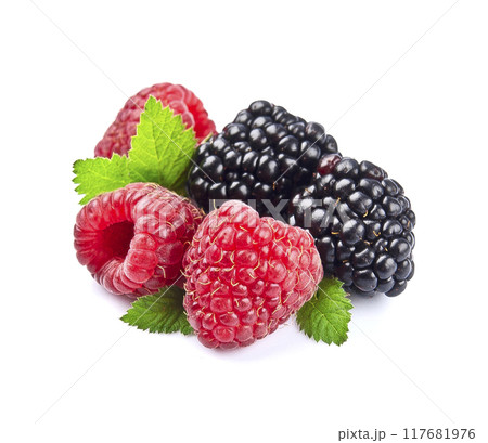 White cup with ripe raspberries with green leaf and one blackberry isolated on white background.