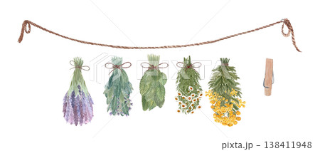 Watercolor dried herb bundle set with lavender, sage, mint, chamomile, yarrow, rope and clothespin. Hand painted botanical clipart collection for herbal branding, labels and rustic natural design.