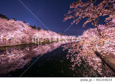 桜満開夜の絶景 弘前城西濠の花筏と水鏡 青森県