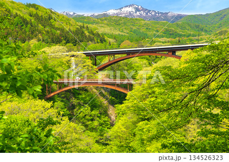 福島県西白河郡西郷村 阿武隈川が流れる渓谷に架かる新旧雪割橋