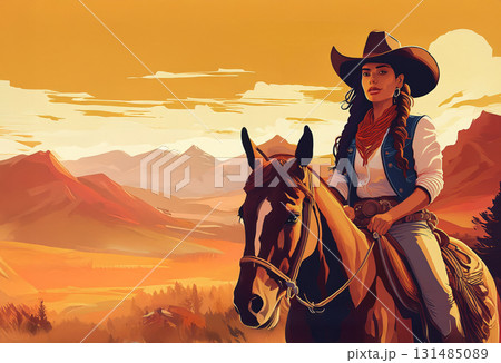 アメリカの西部劇風の風景と馬に乗るカウガール