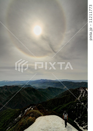 谷川岳・西黒尾根を登る登山者と光環