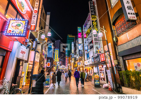 日本の東京都市景観 池袋駅西口・西一番街。スマホゲームに興じる高齢者(左手連打)やウーバーバイク配達