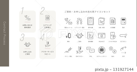 お問い合わせから申し込みまでのご契約の流れをイメージしたフローチャートとベクターアイコンセット