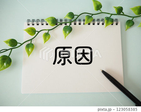 「CAUSE」と書かれた積み木、ペン、ノート、人の手