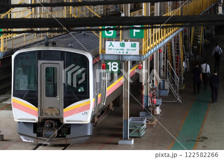 大宮総合車両センターにて検査中のE129系電車(埼玉県さいたま市大宮区)