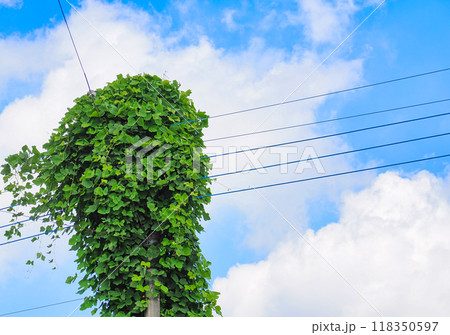 伸びた蔦に覆われた電信柱と青空と雲の風景