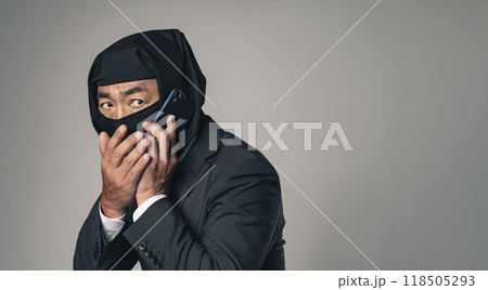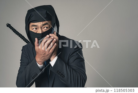 ビジネススーツを着てスマホでこっそり通話する忍者