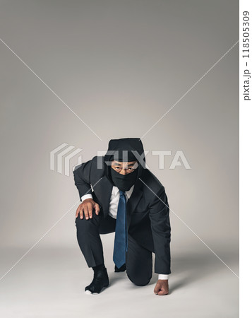 ビジネススーツを着て忍び足で歩く忍者の全身写真