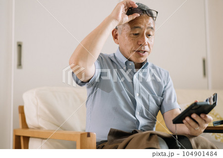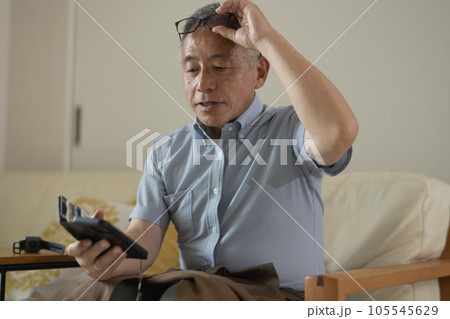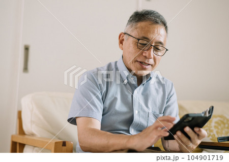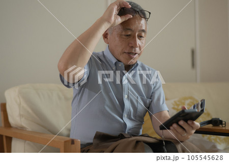 老眼鏡・メガネを掛けてスマホを操作する男性