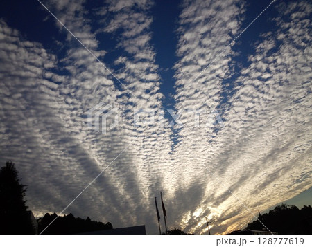 タコの足のような雲と、隠れる太陽光が織りなす幻想的な空模様