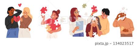 Diverse people characters searching and finding missing pieces of their identity or memory parts