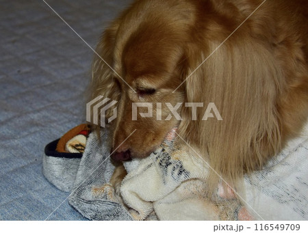 マイペット。食事の後は布を嚙んで遊ぶ。