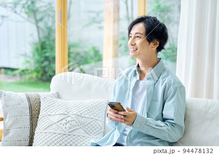 リビングでスマホを操作する男性