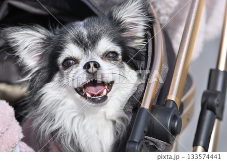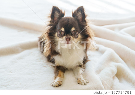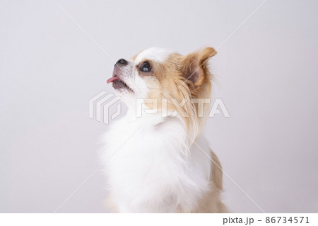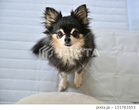 見上げてアイコンタクト 可愛いシニア犬の顔のアップ ロングコートチワワ